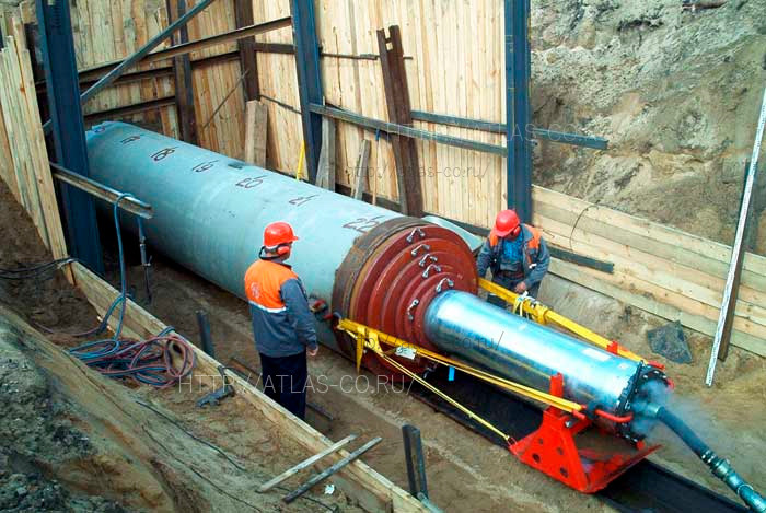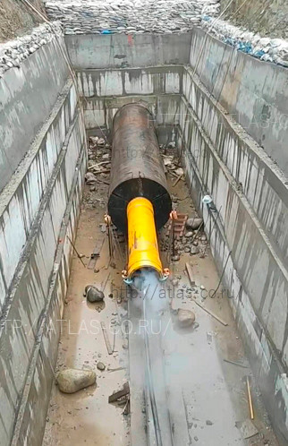Разрыхлённый грунт попадает внутрь трубы. После того как труба достигает приемного котлована, грунтовую пробку извлекают, и прокладка трубопровода считается завершённой.